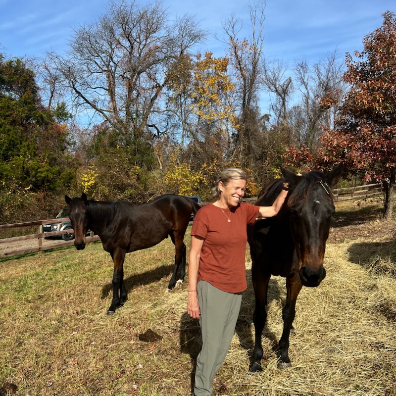 On January 14th, as soon as Noni was released from quarantine and sent to Montpelier, Leslie and Anthony made the drive to meet her. “She didn’t seem to care we were there,” Leslie recalled. Noni was content to continue grazing with her pasture mate until farm manager Crystal teased them over with a little grain. A few pats and treats later, the Arcuris had made up their minds. The very next day, they brought Noni home.