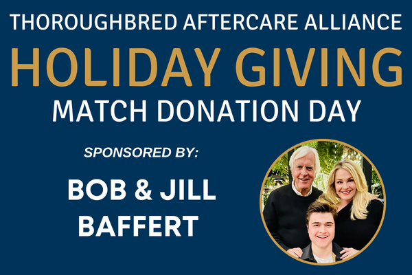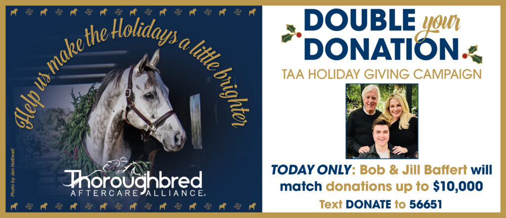 To culminate the Thoroughbred Aftercare Alliance (TAA)’s month-long Holiday Giving Campaign, Bob and Jill Baffert have pledged to match all donations up to $10,000 made to the TAA on Dec. 31, 2022. Not only does New Year’s Eve mark the end of the TAA’s holiday fundraiser, but the Baffert’s $10K match donation is the largest of the campaign. Every donation made to the TAA this Saturday will be matched dollar-for-dollar by Bob and Jill Baffert up to $10K, meaning you could help raise $20,000 towards the care of thousands of retired racehorses across North America.
