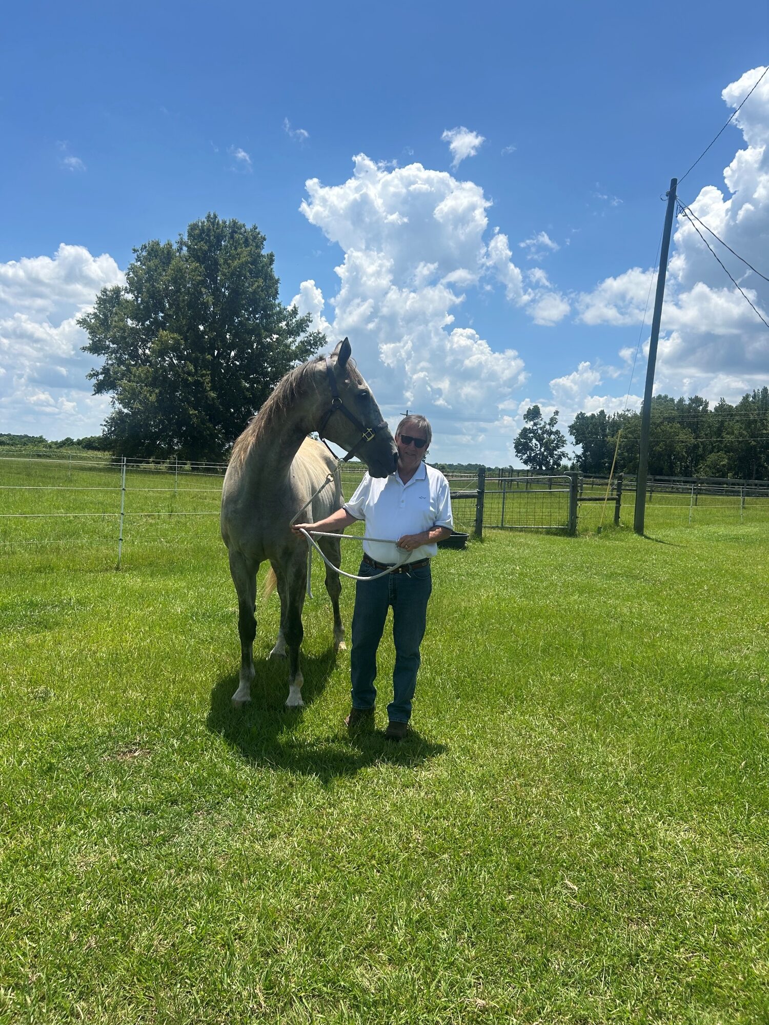 In September 2024, Dana visited Equine Rescue of Aiken during an event, where she spent time watching horses in the recovery and observation paddock. Equine Rescue of Aiken, a Thoroughbred Aftercare Alliance-accredited organization in Aiken, South Carolina, is committed to helping retired racehorses find their second career. During the event, a grey gelding in the field, Somesayneigh, now known as “Nash”, immediately caught her attention. “We were taken by his friendly demeanor and gentle manner,” Dana shared.