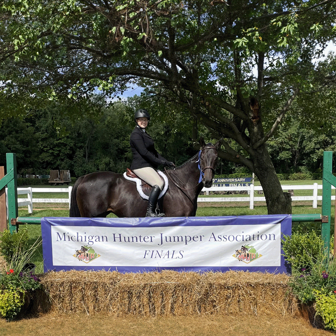 While Friend of Dubai’s progress has been remarkable, it wasn’t without its challenges. Kimberly worked patiently with him, focusing on confidence-building due to his nervous disposition. Their slow and steady approach paid off, and in the summer of 2023, they competed in the 2’3 division at Michigan Hunter Jumper Association (MHJA) local shows. After just two shows, they earned some year-end awards for the division, including reserve champion in the hunter section.