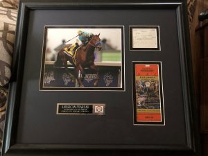 Framed keepsake of 2015 Triple Crown winner American Pharoah with nameplate and Breeder’s Cup victory photo and tickets. These items capture the famed moment in history when American Pharoah became the first horse to win the Grand Slam of Thoroughbred racing.