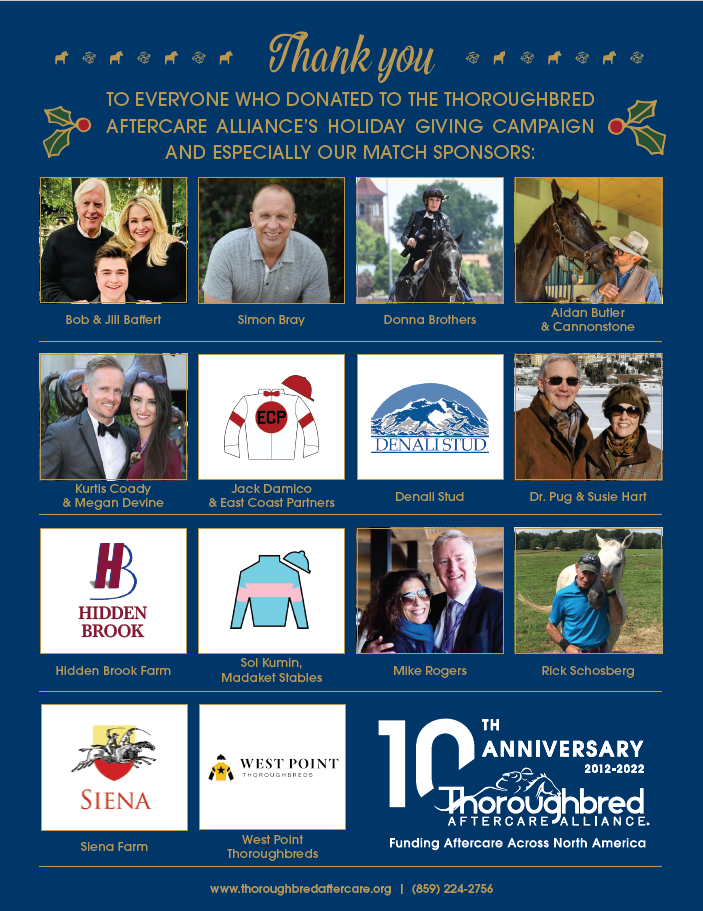The month-long effort to raise funds for the TAA’s 81 accredited organizations and thousands of off-track Thoroughbreds, the TAA Holiday Giving Campaign, ended on Dec. 31st, resulting in $180,000 raised for accredited aftercare.