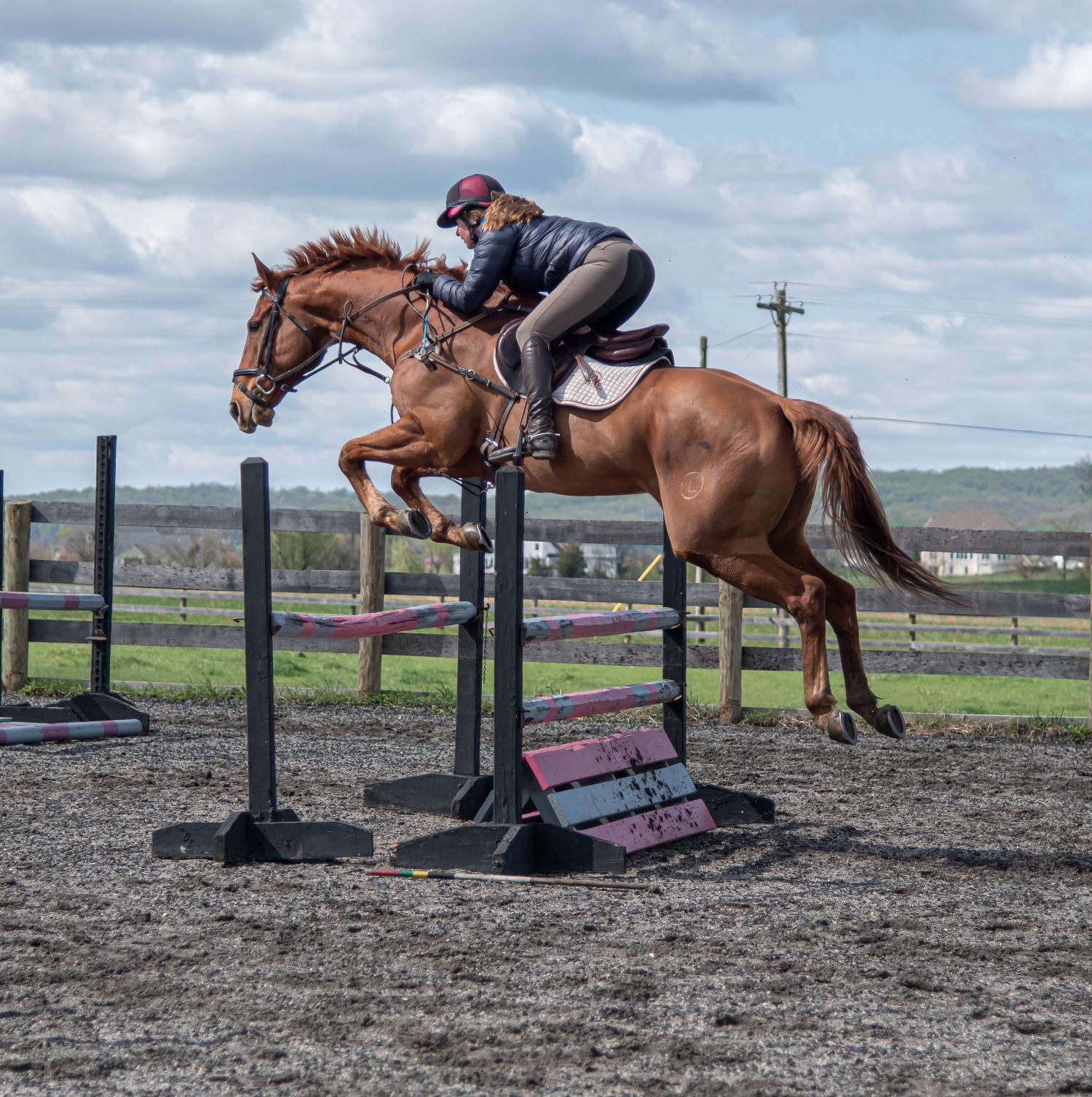 With plans to pursue Eventing, his retraining began with Dressage to establish foundational skills. “During his first training show he danced out of the arena!” Laura exclaimed. Gradually, poles and crossrails were introduced, helping him develop confidence and coordination. At his first off-property show, Rascal carefully walked near standards and poles, learning to navigate new environments and tasks. Over time, his balance and coordination improved, preparing him for Show Jumping.