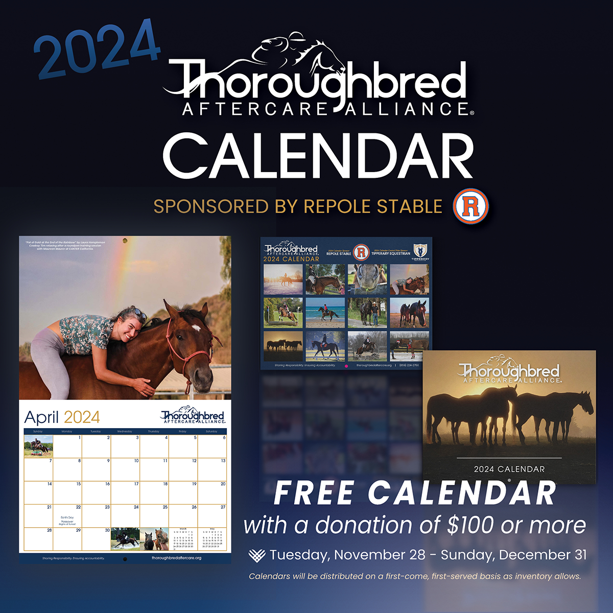 The 2024 Thoroughbred Aftercare Alliance Calendar, sponsored by Repole Stable, will be available beginning on Giving Tuesday, which is set for Tuesday, November 28, 2023. With every online donation of $100 or more made between November 28 to December 31, donors may opt to receive a calendar by noting “2024 Calendar” in the comment field on the donation form. Calendars will be available on a first come first served basis, until inventory is depleted. Donations can be made at: thoroughbredaftercare.org/donation_now